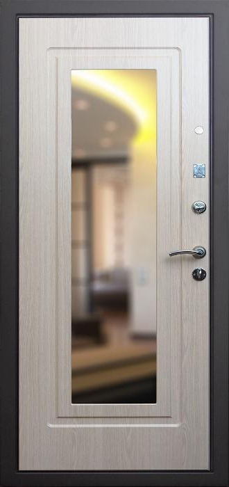 Эта модель создана для тех, кто ценит не только прочность, но и практичность в повседневном использовании. Стальной каркас из профильной трубы и лист металла толщиной 2 мм с рёбрами жёсткости формируют надёжную основу, способную выдерживать серьёзные нагрузки. Снаружи дверь защищена порошковым покрытием, которое устойчиво к влаге, солнцу и механическим повреждениям, а изнутри отделана МДФ-накладкой, придающей интерьеру уют и аккуратность. В центре конструкции внимание привлекает зеркало — удобная деталь, которая избавляет от необходимости в дополнительном настенном аксессуаре и одновременно делает пространство визуально просторнее. Именно здесь название модели — металлическая дверь с зеркалом в дом №2 — обретает своё значение, сочетая функциональность с эстетикой. Для повышения безопасности предусмотрены два замка российского производства с независимыми системами запирания, а также блокираторы. Два контура уплотнителя защищают от сквозняков и пыли, а возможность выбрать направление открывания делает установку универсальной. Металлическая дверь с зеркалом в дом №2 от производителя: быстрое изготовление и монтаж в Щелково, индивидуальные размеры, широкий выбор материалов и фурнитуры, официальная гарантия до 10 лет.