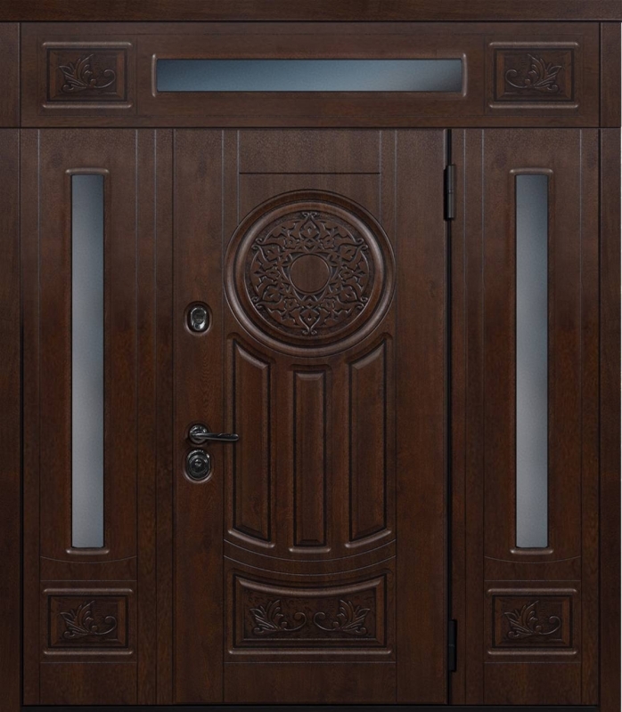 Эта нестандартная парадная дверь с фрамугой №6 — отличный выбор для тех, кто ценит элегантность и долговечность. Внешняя и внутренняя отделка из МДФ придает дверям стильный и современный вид, а также защиту от механических повреждений. МДФ устойчива к царапинам и вмятинам, что делает дверь идеальной для долгосрочной эксплуатации. Каркас из профильной трубы 50х25 мм и лист металла толщиной 2 мм обеспечивают прочность и надежность, а ребра жесткости из профильных труб гарантируют дополнительную устойчивость. В двери установлены блокираторы, два контура уплотнителей из резины, что повышает звуко- и теплоизоляцию. Замки от известных производителей, таких как Просам и Мосрентген, обеспечат надежную защиту. Возможность комбинировать отделку, добавлять зеркало, стеклопакет или кованые элементы позволяет легко адаптировать дверь под любые предпочтения. Нестандартная парадная дверь с фрамугой №6 от производителя: быстрое изготовление и монтаж в Щелково, индивидуальные размеры, широкий выбор материалов и фурнитуры, официальная гарантия до 10 лет.