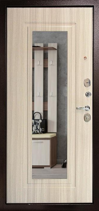 Прочный стальной каркас, лист металла толщиной 2 мм и система блокираторов делают эту модель надежным барьером для квартиры, офиса или частного дома. Внешняя поверхность покрыта молотковым напылением, устойчивым к механическим повреждениям и перепадам температуры, благодаря чему дверь сохраняет аккуратный вид долгие годы. Внутренняя накладка МДФ добавляет уюта и гармонично сочетается с интерьером прихожей. Зеркало на полотне выполняет не только декоративную функцию, но и делает пространство визуально шире. Зеленая входная дверь в квартиру №2 комплектуется двумя замками российских производителей — сувальдным Просам и цилиндровым Мосрентген, каждый из которых оснащён тремя ригелями. Два контура резинового уплотнения помогают минимизировать сквозняки и шум, а возможность выбрать сторону и тип открывания делает установку максимально удобной. При необходимости отделку, замки и дополнительные элементы можно адаптировать под индивидуальные требования. Зеленая входная дверь в квартиру №2 от производителя: быстрое изготовление и монтаж в Щелково, индивидуальные размеры, широкий выбор материалов и фурнитуры, официальная гарантия до 10 лет.