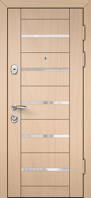 Эта бронированная дверь в современном дизайне №28 станет отличным решением для частного дома, квартиры или офиса, предлагая надежную защиту и стильный внешний вид. Ее конструкция включает каркас из профильной трубы 50х25 мм и металлическое полотно толщиной 2 мм, что обеспечивает прочность и долговечность. Внешняя и внутренняя отделка выполнены из плиты МДФ, придающей двери современный вид и стойкость к механическим повреждениям. Хотя терморазрыв отсутствует, конструкция с терморазрывом коробки и полотна помогает снижать теплопотери. Дополнительную безопасность обеспечивают два замка — сувальдный и цилиндровый, оба с тремя ригелями. В дверь можно добавить зеркало, стеклопакет или кованые элементы, а также установить видеодомофон, что делает эту модель максимально универсальной и индивидуальной. Бронированная дверь в современном дизайне №28 от производителя: быстрое изготовление и монтаж в Щелково, индивидуальные размеры, широкий выбор материалов и фурнитуры, официальная гарантия до 10 лет.
